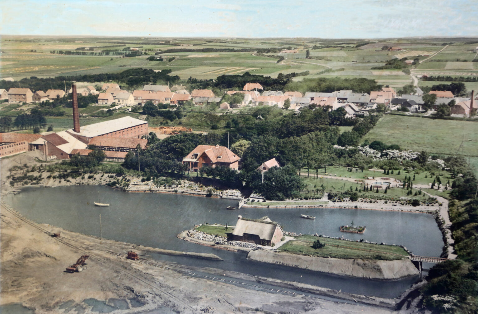 Grønbjerg omkring 1952 set fra syd med Grønbjerg Teglværk i forgrunden til venstre. (Fotograf ukendt)